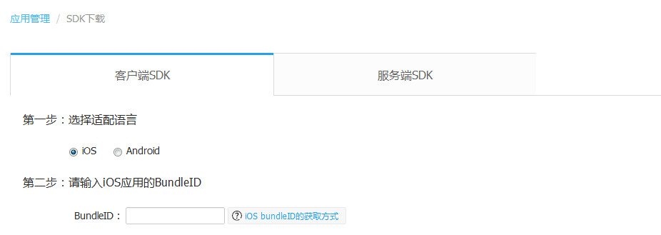 Android SDK需要先提供带你的keystore签名的apk程序包,对APK中程序没有要求,主要目的是用来生成和你Android应用绑定的专属客户端SDK;iOS SDK需要提供你的BundleID,用来生成你iOS应用绑定的专属客户端SDK。