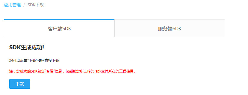 SDK生成完毕,弹出窗口显示如下,用户点击“下载”即可启动下载。