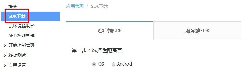 点击SDK下载(从这个页面进入),打开SDK下载界面,里面提供的Android和iOS客户端SDK,服务端 SDK下载。