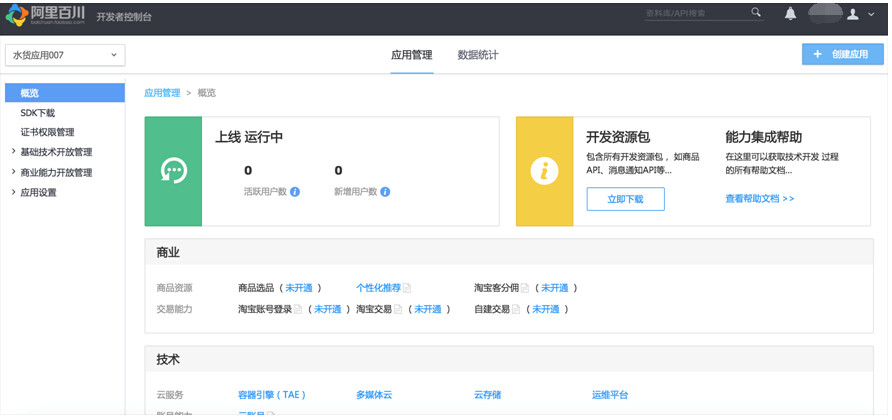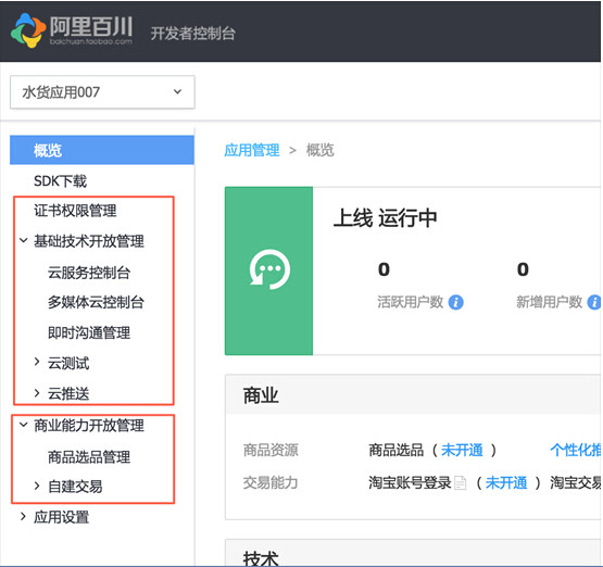 部分产品需要在对应的后台操作使用,如云测试需要在后台提交客户端安装包等。百川的各产品后台 统一入口在管理控制台首页,技术、商业产品在控制台左侧菜单,运营管理统一在顶栏数据统计菜单栏中。