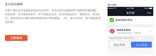 4)“服务推广”菜单中还可开启“支付成功推荐”功能,当用户通过支付宝通道向你支付成功时,在支付成功页面向用户推荐你的生活号。目前支持:支付宝SDK支付、支付宝钱包支付、支付宝Wap支付、条码支付、声波支付。如图所示: