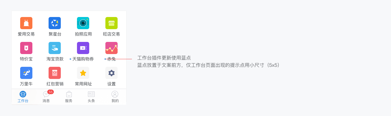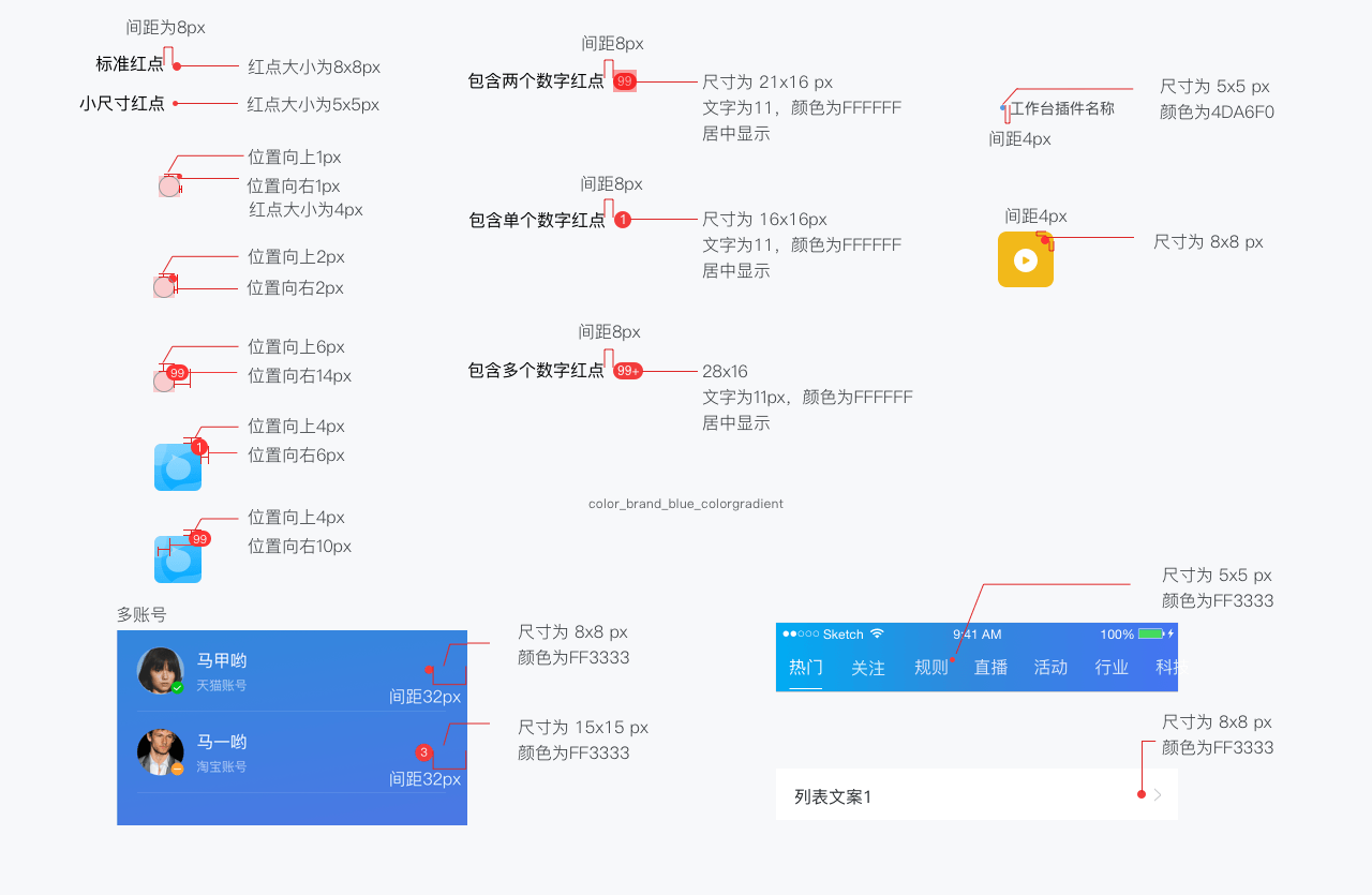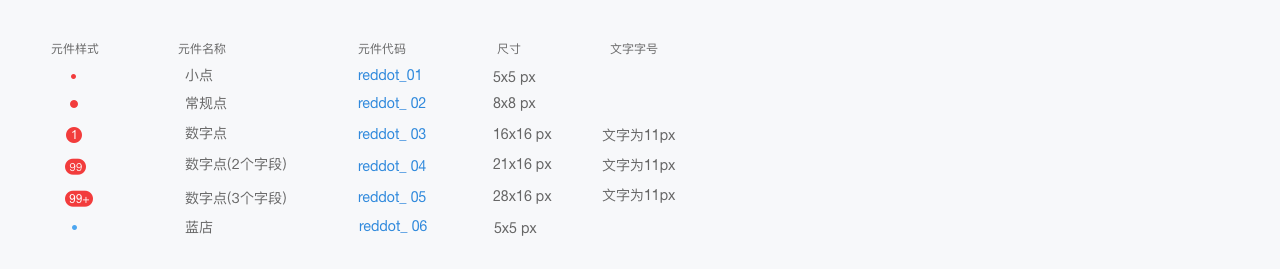 在有新消息,讯息时,或者是app/插件/功能模块可以更新,升级时使用这个提醒样式。位置:有icon的情况时一般居于icon右上角,无icon的情况下一般位于标题后侧或文案前方。