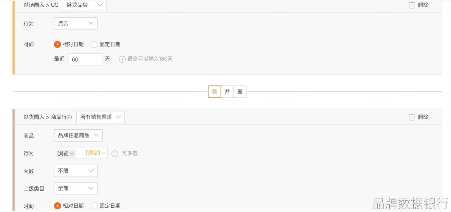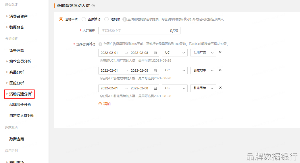 通过营销活动沉淀可获取UC二级触点“卧龙品牌”、“卧龙效果”、“汇川广告”所有行为并集的人群。以活动形式沉淀分析人群。