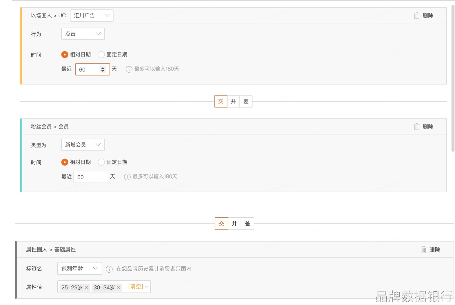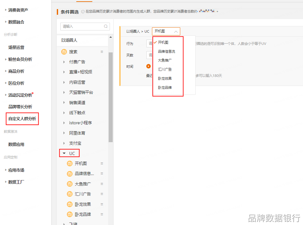 以场圈人-UC渠道下支持指定“卧龙品牌”、“卧龙效果”、“汇川广告”二级触点、指定时间范围来圈选被广告 “曝光或点击”的人群,进一步分析。