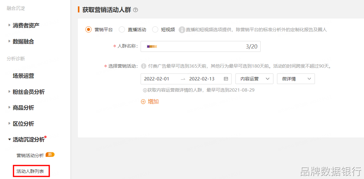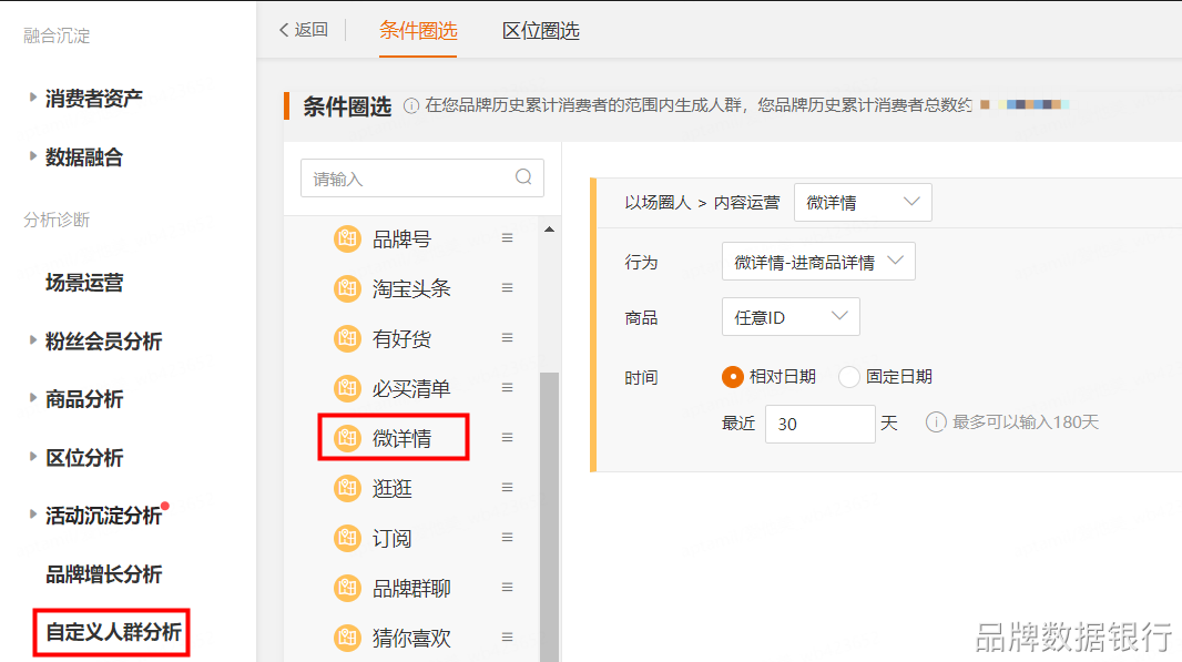 通过营销活动沉淀可获取品牌微详情所有行为并集的人群。