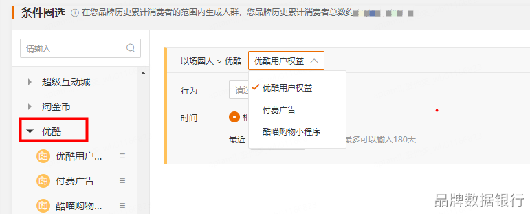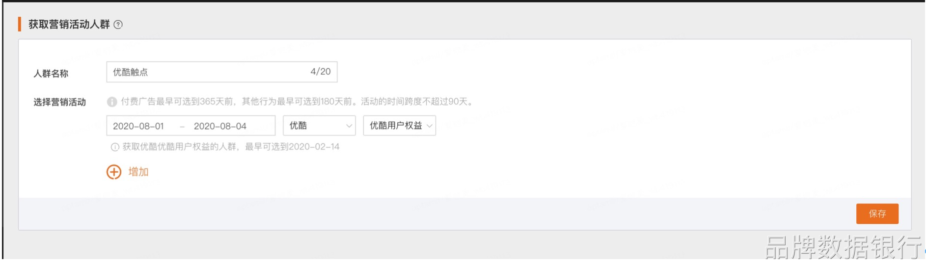 通过营销活动沉淀可获取在优酷/优酷创新广告所有曝光/点击行为并集的人群。