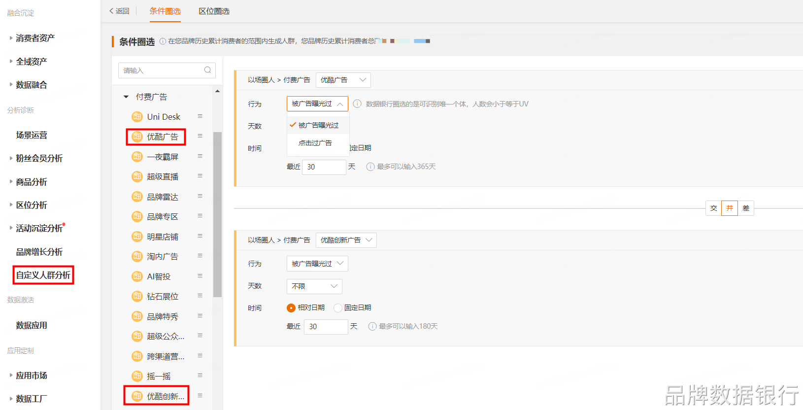 以场圈人-付费广告下选择“优酷/优酷创新广告”触点圈选曝光和点击人群,做进一步洞察分析。