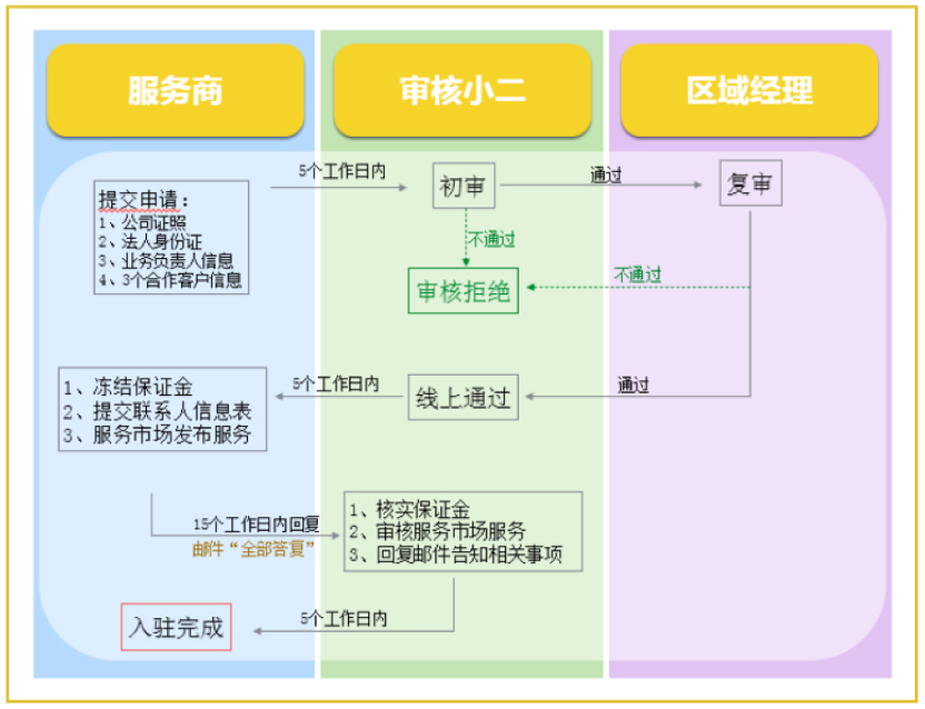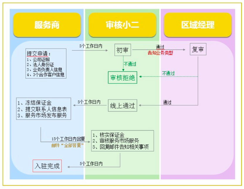 1、需遵守《服务市场管理规范》第三章服务商入驻条件 2、须是公司性质,且注册成立一年以上 5、认可阿里妈妈广告产品对于商家的价值,将申请业务作为独立业务进行开展,且能提供近一年清晰明确的业务规划(在协议上传的同时上传) 6、资质申请通过后五个工作日内,冻结保证金5万元 |