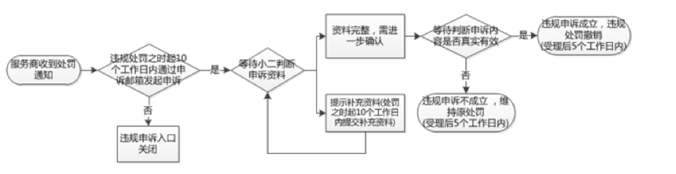 2) 被投诉服务商在淘宝平台告知处罚结果之日起10个工作日内,有权对处理结果进行违规申诉;违规申诉的流程与实施细则如下图: