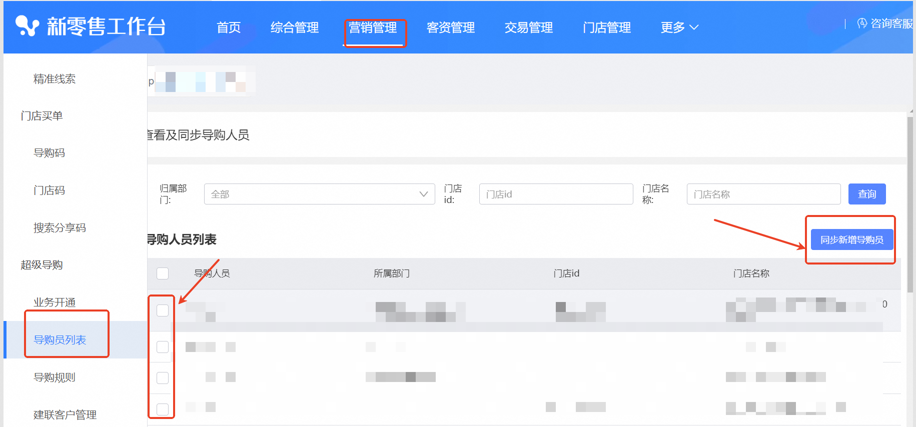 pc端新零售工作台-营销管理-超级导购--导购员列表-选中导购员后 点击“同步新增导购员”后可正常进入分享码插件