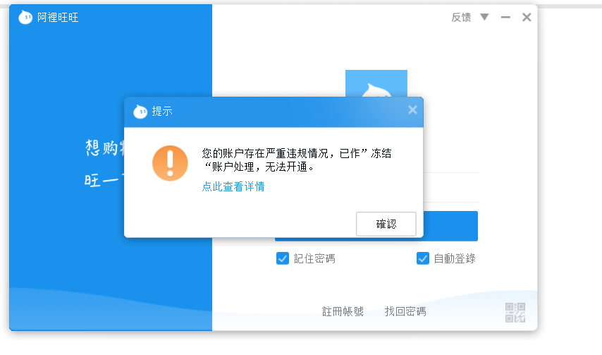 你好...我是台灣用戶我的阿里旺旺被鎖住了 凍結了
